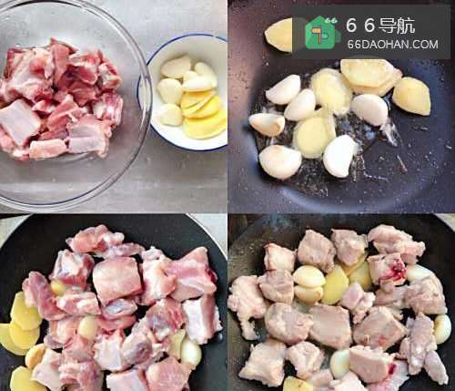 2锅里下油小火把蒜头、生姜片爆炒香,接着把腌好的排骨倒入锅中两面煎熟