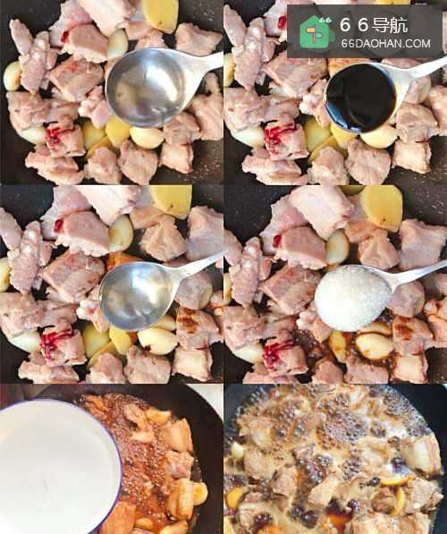 3加入黄金酱汁1勺料酒、2勺酱油(生抽➕老抽)、3勺白米醋、4勺白砂糖依次加入锅中,加入少许盐后搅拌均匀,倒入大半碗的清水