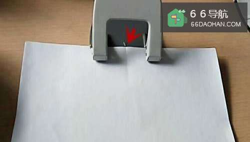 6将纸张塞进打孔机里,纸张的中心点与打孔机的中心指示点对齐。