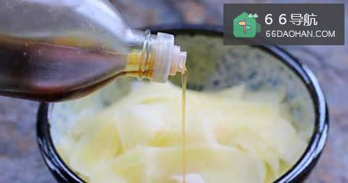 5土豆片过凉后捞出,沥水,先淋入香油搅拌均匀,