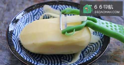 2土豆洗净泥土,削掉外皮,然后用削皮刀削成长条状的薄片,如图。