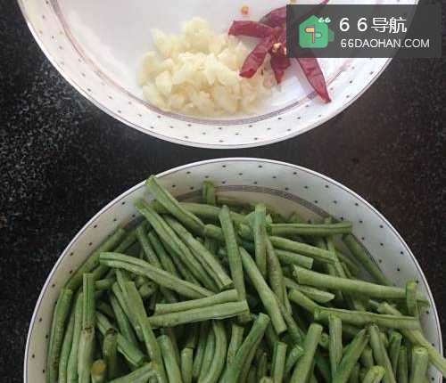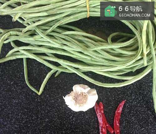 准备所需食材豇豆、蒜、干红辣椒等。