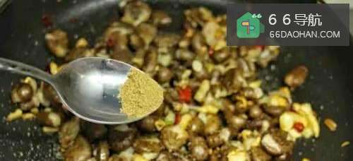 5炒一两分钟后就可以调味了,盐、白糖、孜然放进去炒均匀。