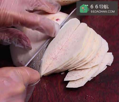 准备两个香芋,去皮清洗干净,切成薄片。
