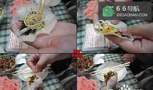再卷入萝卜丝、折耳根(鱼腥草)、海带丝、黄瓜丝、粉丝、腌萝卜、炸黄豆、糊辣椒等。