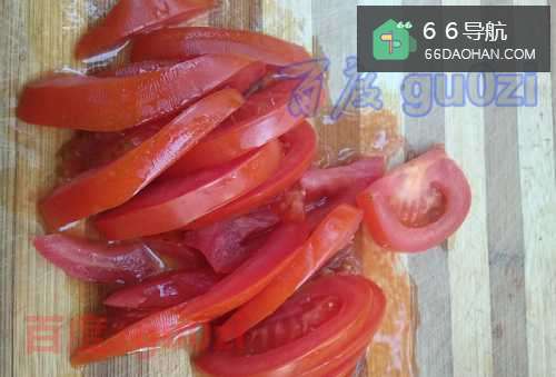 3将西红柿对半切开后,于切得片状,不用要太小片,