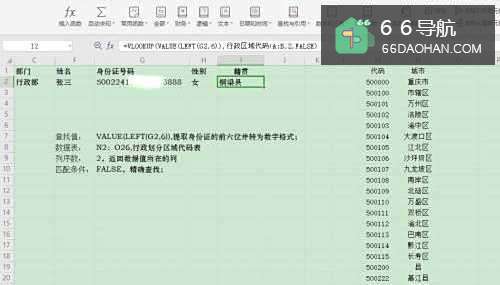 查找值【VALUE(LEFT(G2,6))】,提取身份证的前六位并转为数字格式;