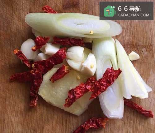 把大葱、干辣椒切段,蒜切成小块,姜切片备用