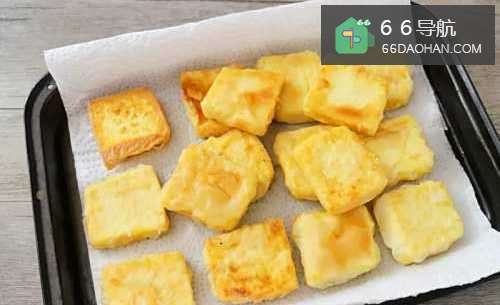 2豆腐切适当大小块,平底锅或油炸至表面金黄,一样沥干油份备用。