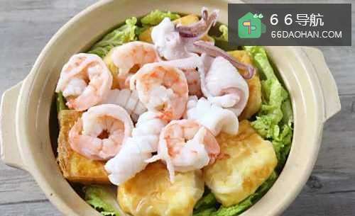 5接着摆上豆腐及海鲜,再淋上酱汁,盖上锅盖后,放在炉上中小火加热约10分钟。