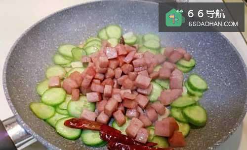 小黄瓜切薄片,午餐肉切成丁状,蒜头切片彩联备用