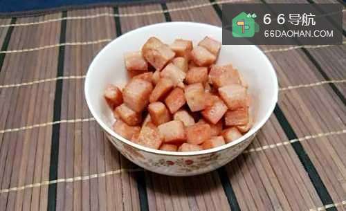 2热锅加少许的油,言贪将午餐肉煸香后盛起