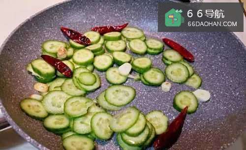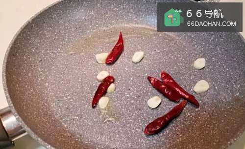 3热锅加1匙油,把蒜片及干辣椒下锅爆香