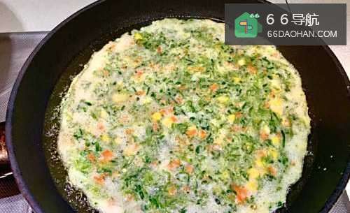 6待蛋液表面已凝固,用同蛋面积盘子扣上翻转过来再移入烘蛋,续煎另一面至成金黄酥香