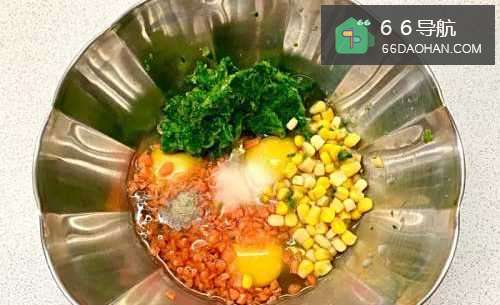 4盆中放入蛋、苦瓜、玉米、红萝卜,再放入糖、醋、白胡椒粉、料酒后搅拌均匀
