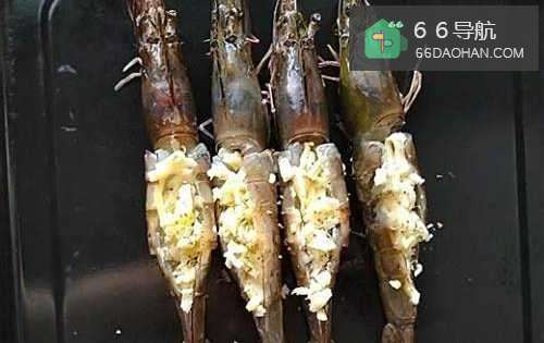 3将虾子移到烤盘上排好,在虾肉上涂少许蒜味抹酱增添风味。
