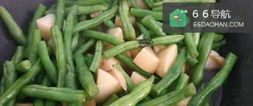4最后,豆角炖的差不多后,再把切好的土豆块放入锅中,一起进行炖,炖好后放入准备好的调料,进行调味,一道味道鲜美的土豆炖豆角就做好了!