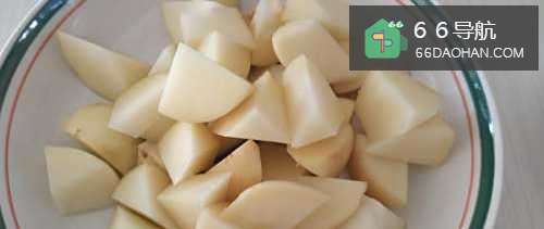 2然后把土豆切成小块,豆角掰成段,葱切成葱花备用。