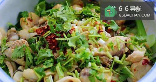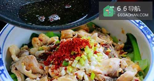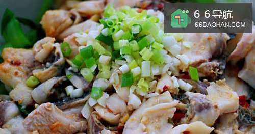 14把捞出的鱼肉片铺在鱼头和鱼排上面,撒上葱花和大蒜末。