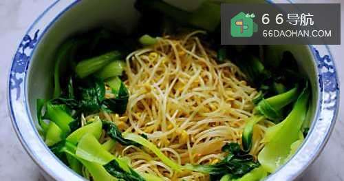 5把洗净的小油菜和黄豆芽菜进行焯水后捞出沥干水分备用。