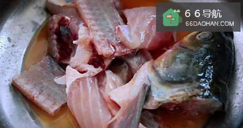 4把鱼头和鱼排也用麻辣调料包的腌制粉腌制一下。