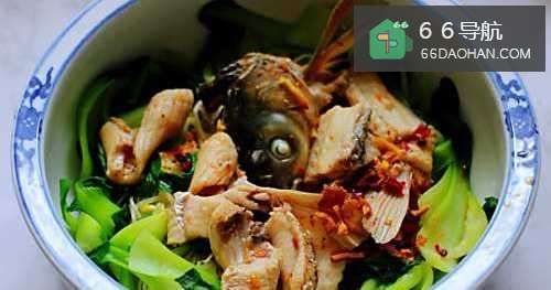 11先把煮熟的鱼头和鱼排捞出来铺到小油菜和黄豆芽上面。