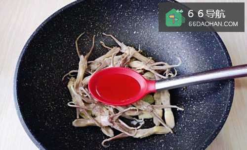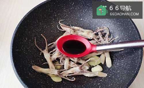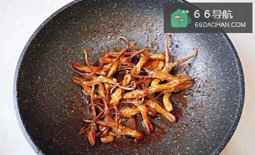6加入生抽,老抽,翻炒均匀,至鸭舌均匀上色。