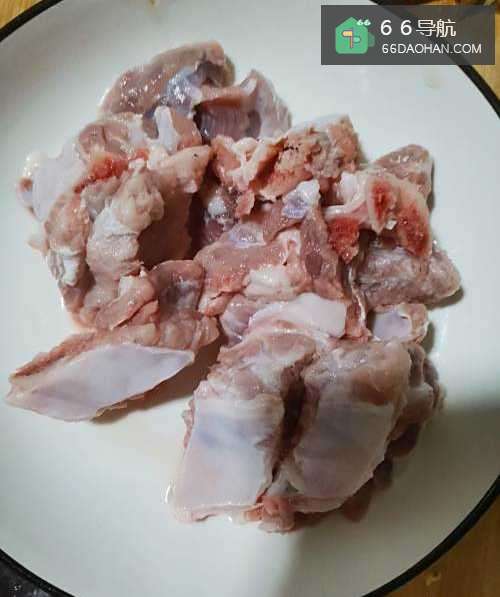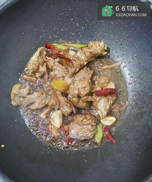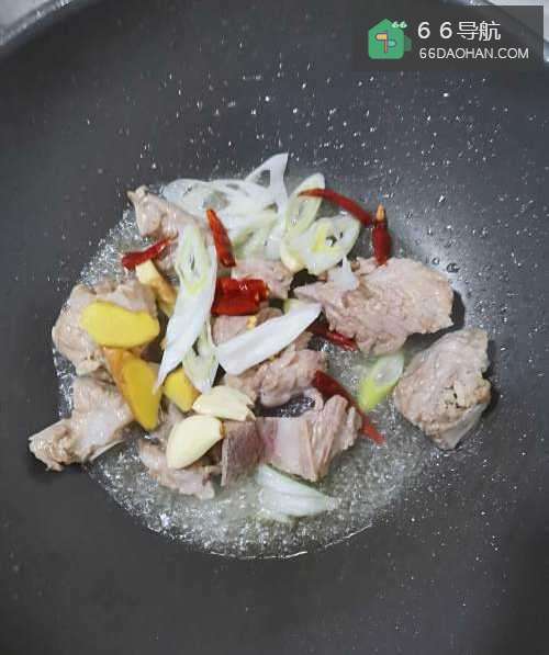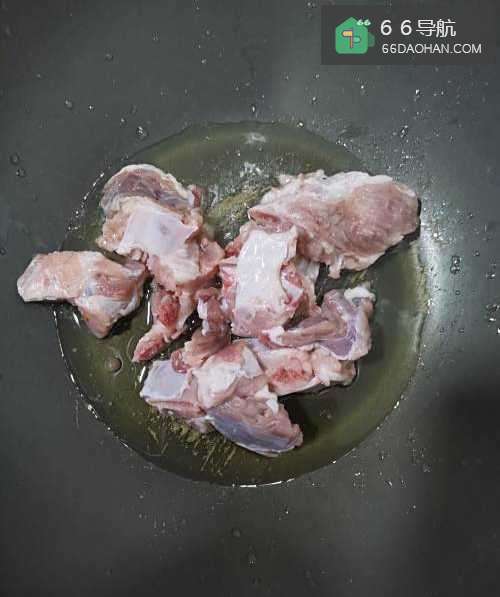 2然后,锅中倒入适量的食用油,待油温热后,放入排骨块大火快速翻炒五分钟。