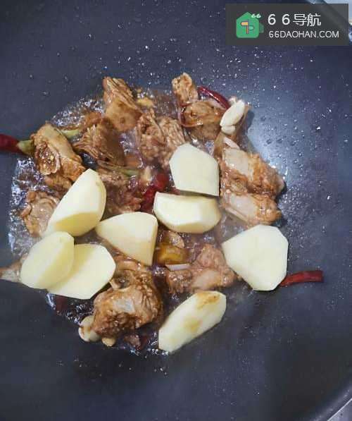 5接着,再往锅中倒入土豆块,大火快速翻炒六分钟。