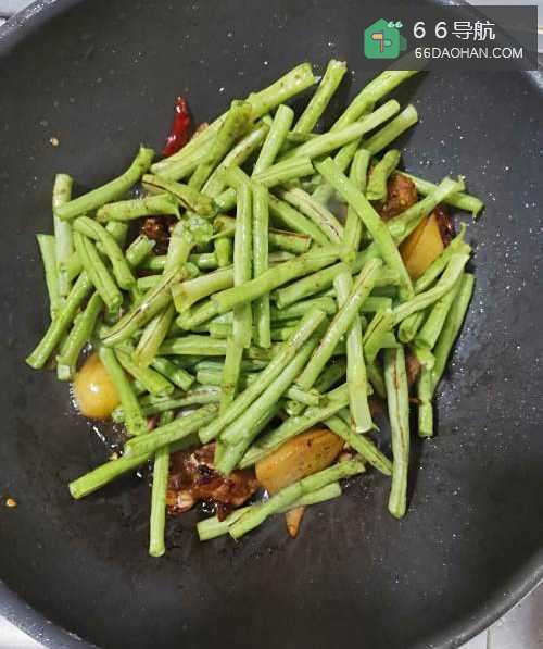6之后,在往锅中倒入豆角,大火翻炒两分钟。
