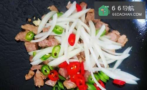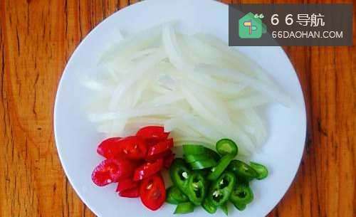 2洋葱切丝,红绿椒去籽切成辣椒圈。