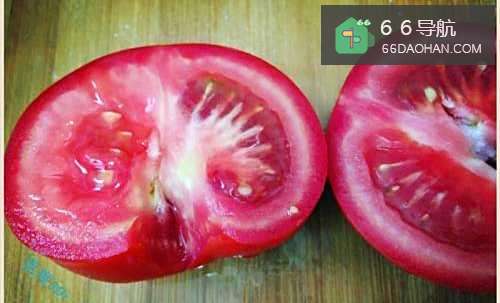 3在煎豆腐的时候准备其它食材,取一新鲜西红柿,将其洗净,用菜刀对半切开,剜去蒂头较硬部分,用菜刀将其切成薄片,然后剁成西红柿泥。