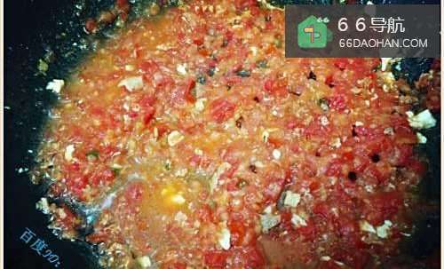 7待西红柿汁快干了,加入前面准备好的勾芡汁,若不够可以加入少许水,用炒勺翻动,待勾芡汁变浓后尝试一下味道看看,如果合适就可以关火装盘出锅了。