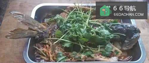 5然后将香菜蒜泥,孜然粉,葱花洒在鱼身,待汤汁收到鱼底部即可出锅上盘(铁盘哦)