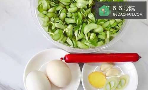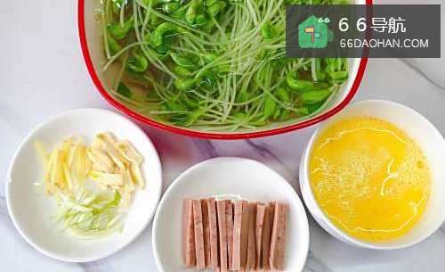 首先我们来准备这款“火腿鸡蛋炒黑豆苗”需要用到的食材柴鸡蛋2个,鲜脆的豆苗需要用嫩黄的炒蛋来配色,太素了有豆腥味,所以再配一根火腿肠吧,最后一定要备上葱姜蒜炝锅提鲜。