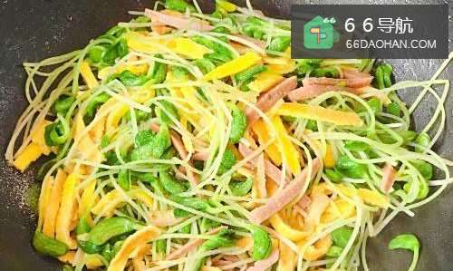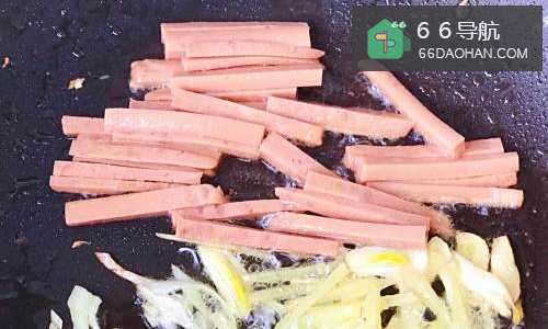 喜欢吃烤香肠口感的可以将火腿丝煸炒至金黄脆皮状,喜欢吃细嫩的简单翻炒几下就可以。
