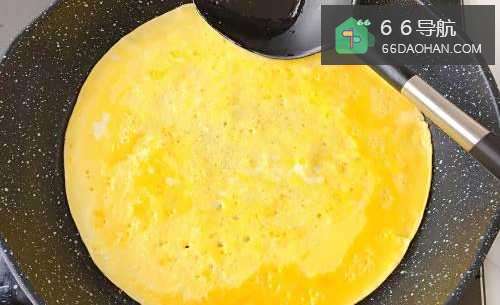 5取平底锅开火热锅至掌心有灼热感,倒入适量花生油,油热改小火,将搅拌均匀的鸡蛋液像摊煎饼一样倒入平底锅,我家的锅不大,两个鸡蛋的蛋液正好将锅底铺满,小火加热将蛋液摊至表层凝固,鸡蛋饼的底色也煎熟了。