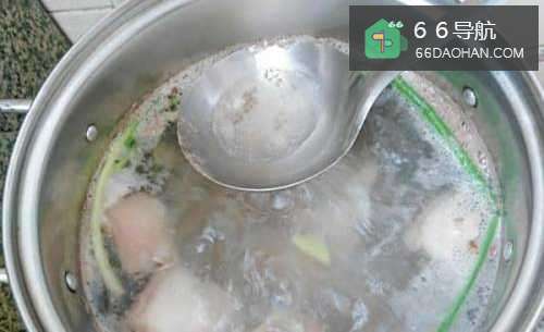 3将猪脚冷水下锅,并在锅里投入10粒花椒,1根葱结,3片姜和1汤匙料酒,不用盖盖子,待水煮沸后,用勺子瓢去浮沫,煮两分钟后把猪脚捞出,放在流水下冲洗掉血沫。