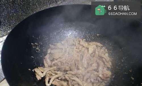 3热锅凉油炒熟肉丝,喜欢吃辣椒的可以加点辣椒进去!