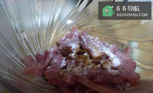 2猪肉切成小细丝,然后放到碗中,加料酒1勺、食盐半勺、酱油半勺、食醋1勺、淀粉、食用油抓匀腌制半小时!