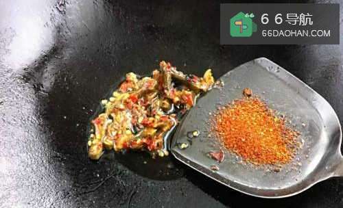 2热好油锅,放入适量辣椒酱和辣椒粉煸出香味。