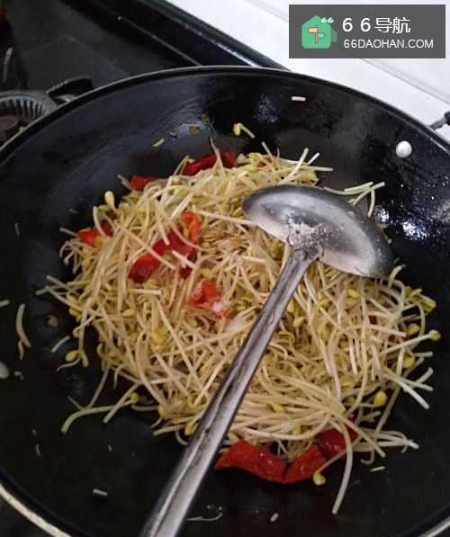 3倒入豆芽,放入适量的盐、白醋翻炒至成熟