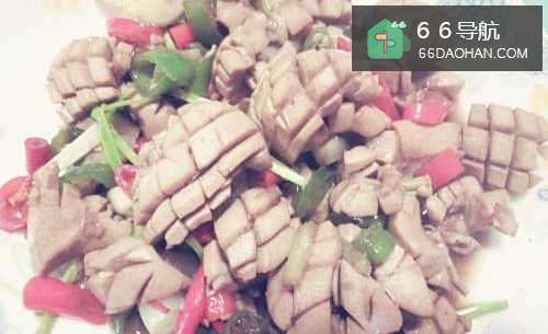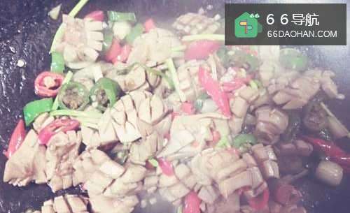 辣椒炒变色后倒好备好的腰花,加入盐,料酒同炒。