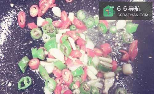 热锅热油,先将切好的辣椒和葱白爆炒一下,加入盐去辣。