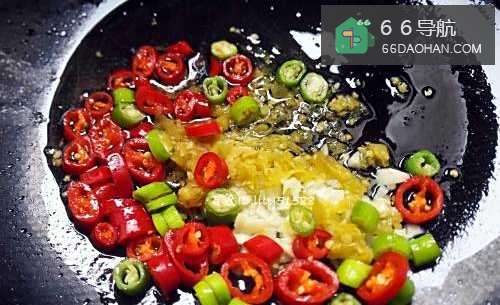 3烧热锅放入少许油,把青、红尖椒,泡椒,蒜末一起放入锅里用大火爆香。
