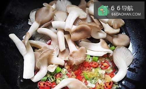4蒜末和辣椒炒出香味之后,放入平菇用大火翻炒两分钟。