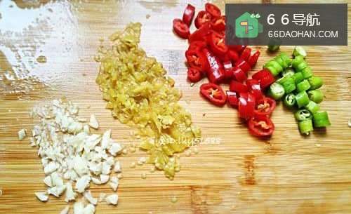 2准备好2个红尖椒,1个青尖椒,3个泡椒,2个蒜瓣洗干净,分别切好备用,如图所示。