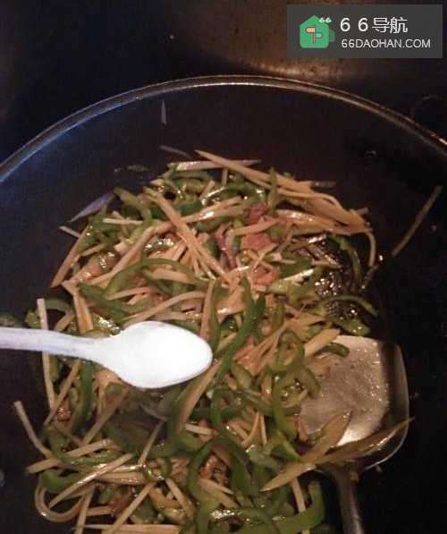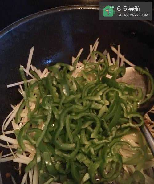 6再将青椒丝全部倒入锅中,和肉丝、土豆丝一起炒匀。