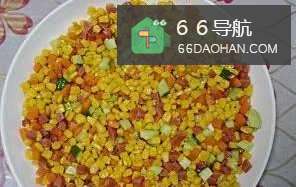 2准备切胡萝卜丁,黄瓜丁,火腿丁(火腿肠最好用肉的,别用淀粉肠。