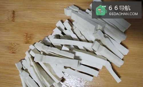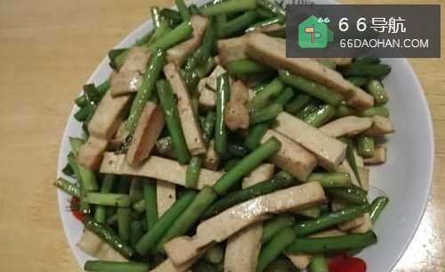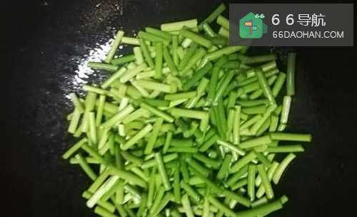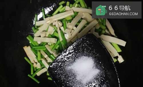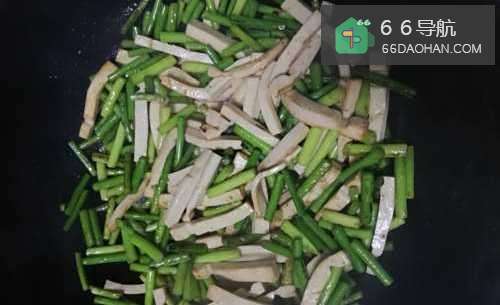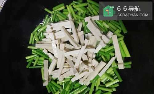 4蒜苔的颜色变得翠绿时,豆干放入锅中翻炒